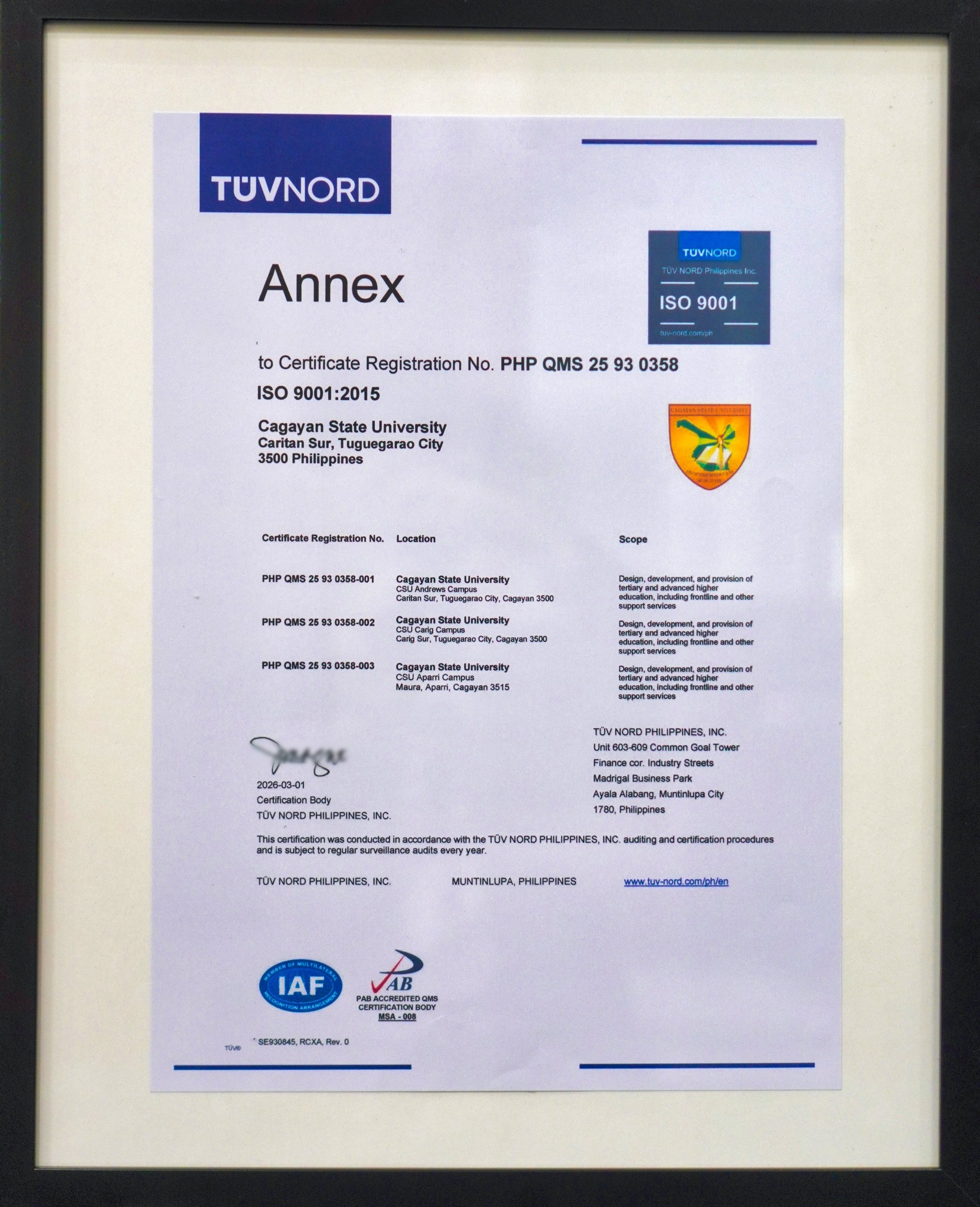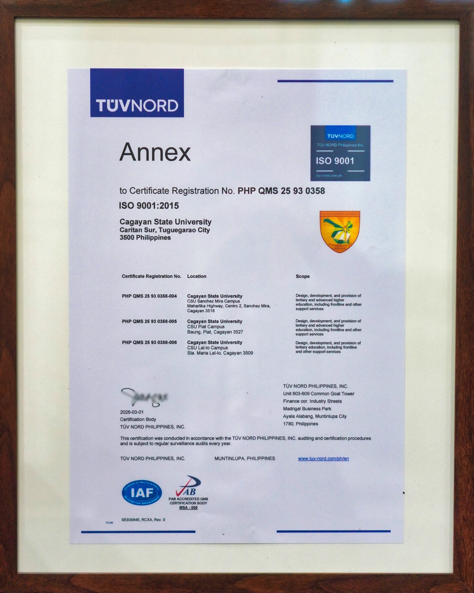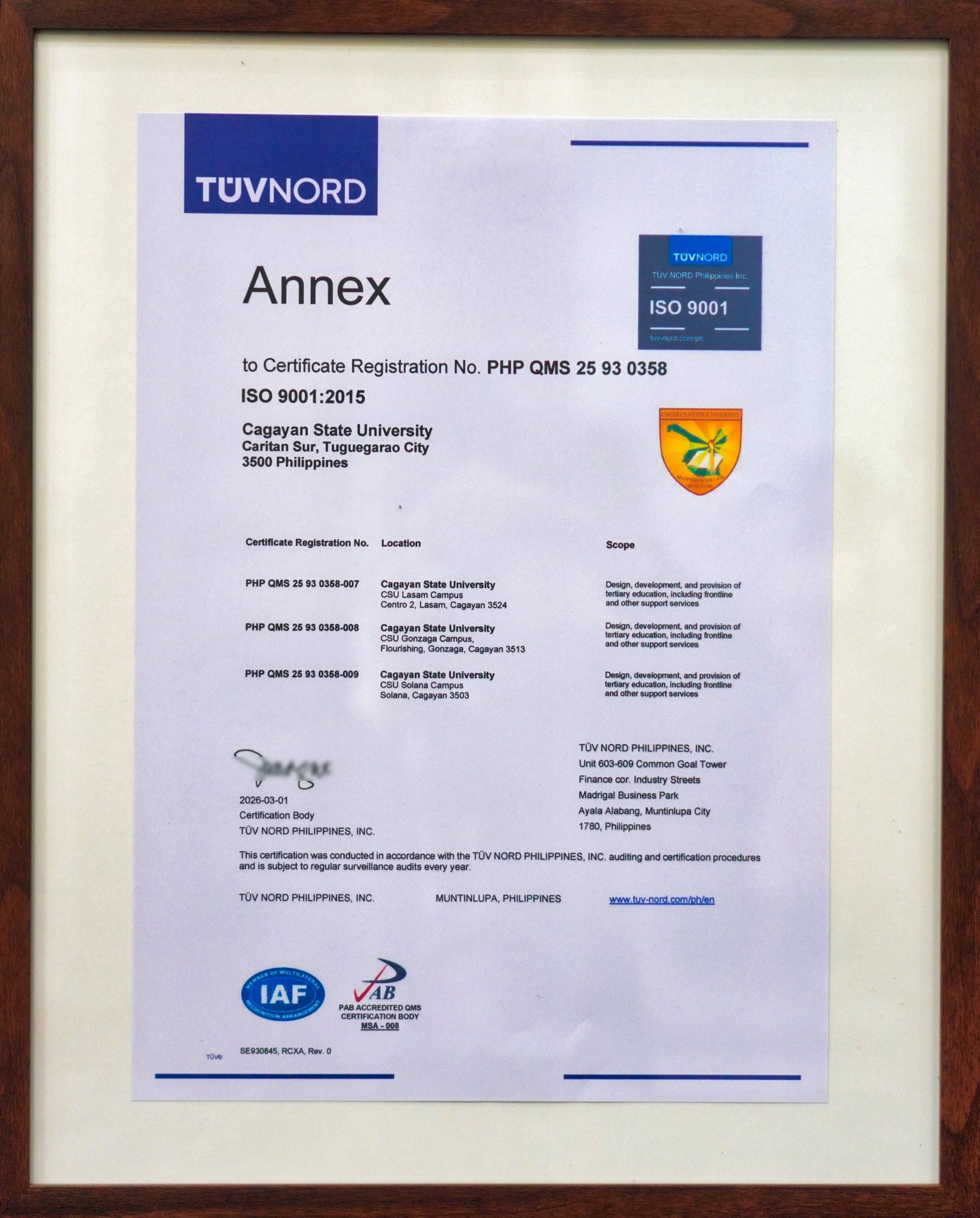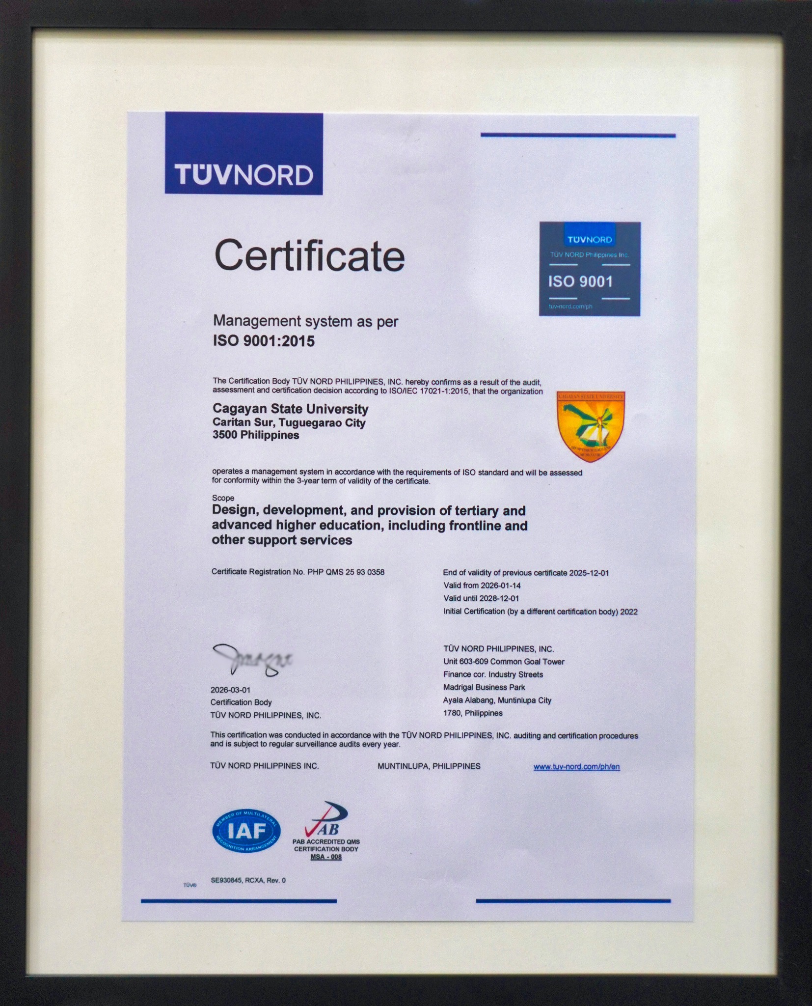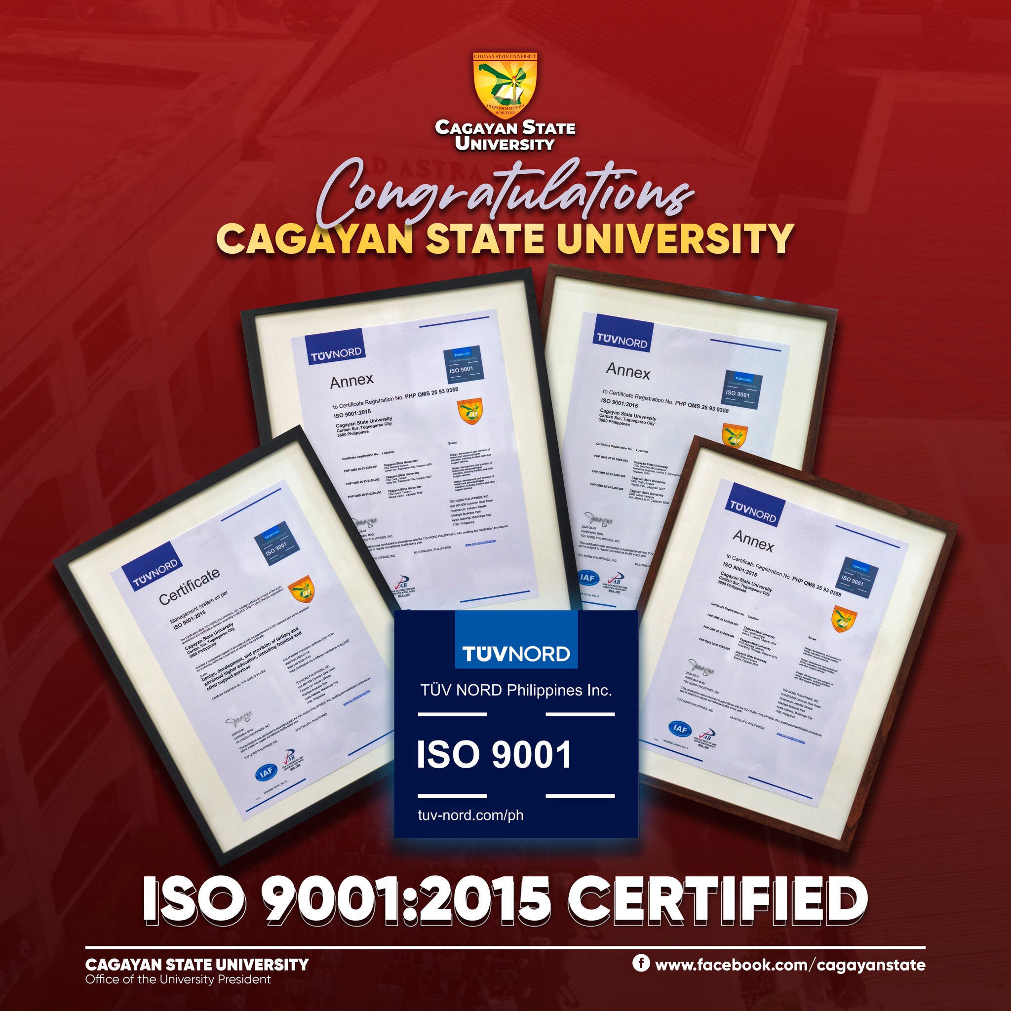 Cagayan State University (CSU) has officially received its ISO 9001:2015 certification from TÜV NORD Philippines, Inc. today, April 13, 2026.