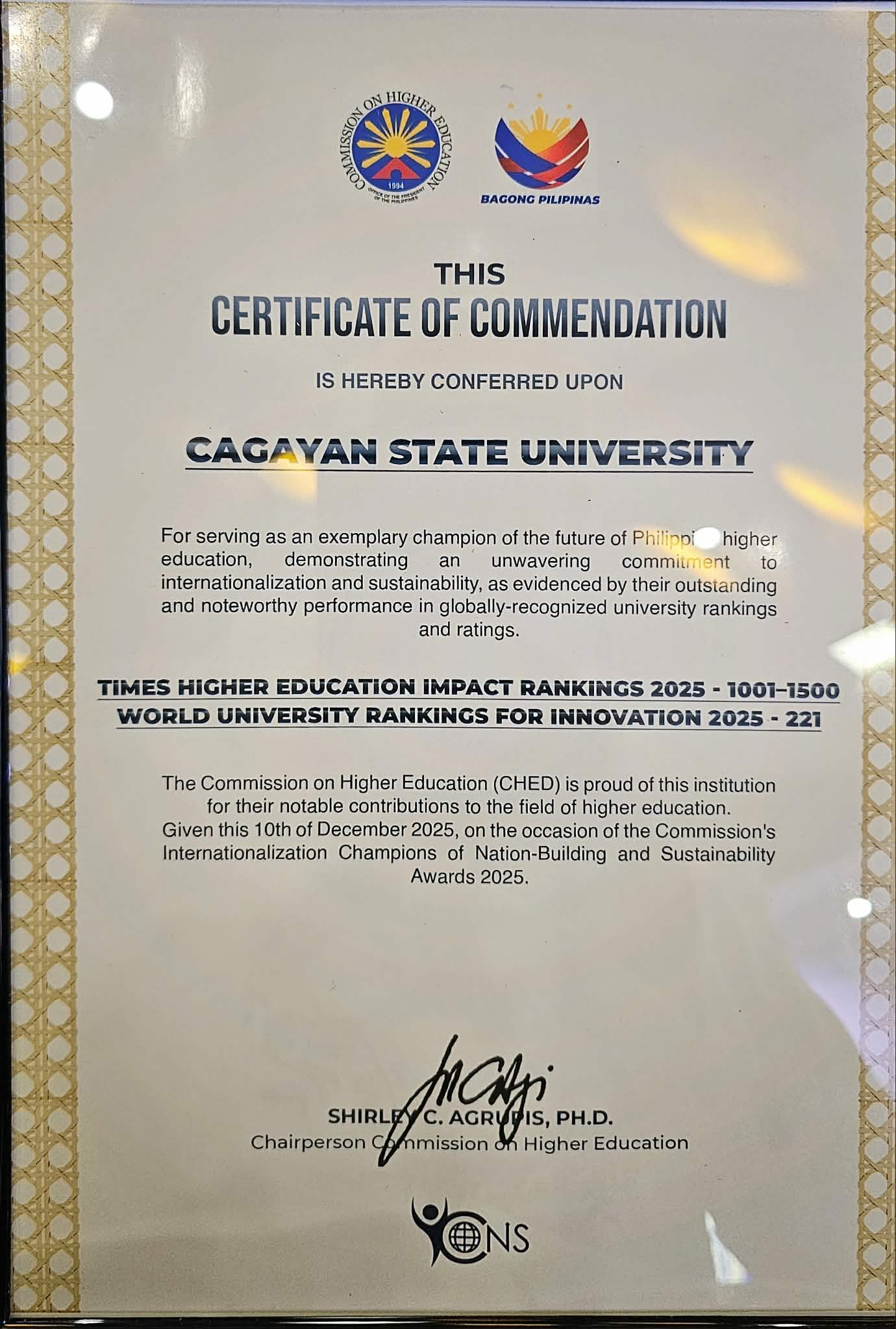 On behalf of Cagayan State University (CSU), President Dr. Arthur G. Ibañez received a prestigious national award today during the Commission on Higher Education (CHED) Internationalization Champions of Nation-Building and Sustainability (ICONS) Awards 2025, held at the Philippine International Convention Center.