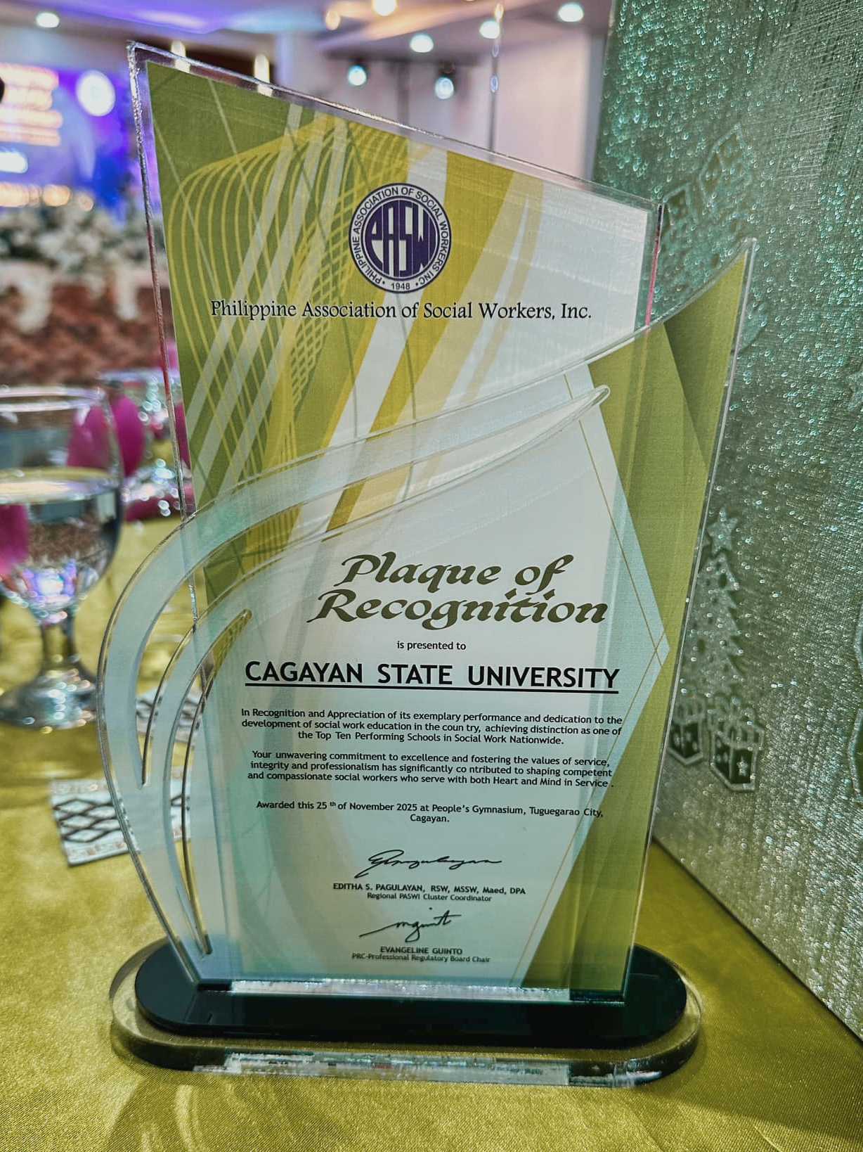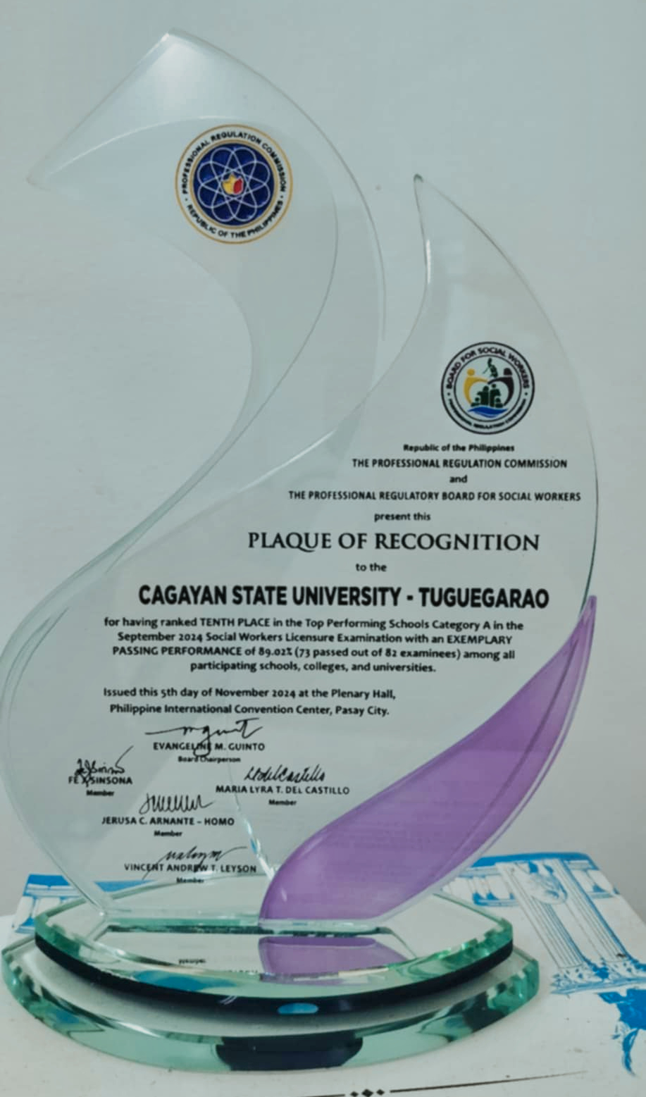 The Professional Regulation Commission (PRC), Philippine Association of Social Workers, Inc. (PASWI), and Sanguniang Panlalawigan of Cagayan Province recognized Cagayan State University (CSU) as one of the Top 10 Performing Schools in Social Work nationwide during the oath-taking ceremonies for newly licensed social workers held at PICC Manila and Tuguegarao City People’s Gymnasium.