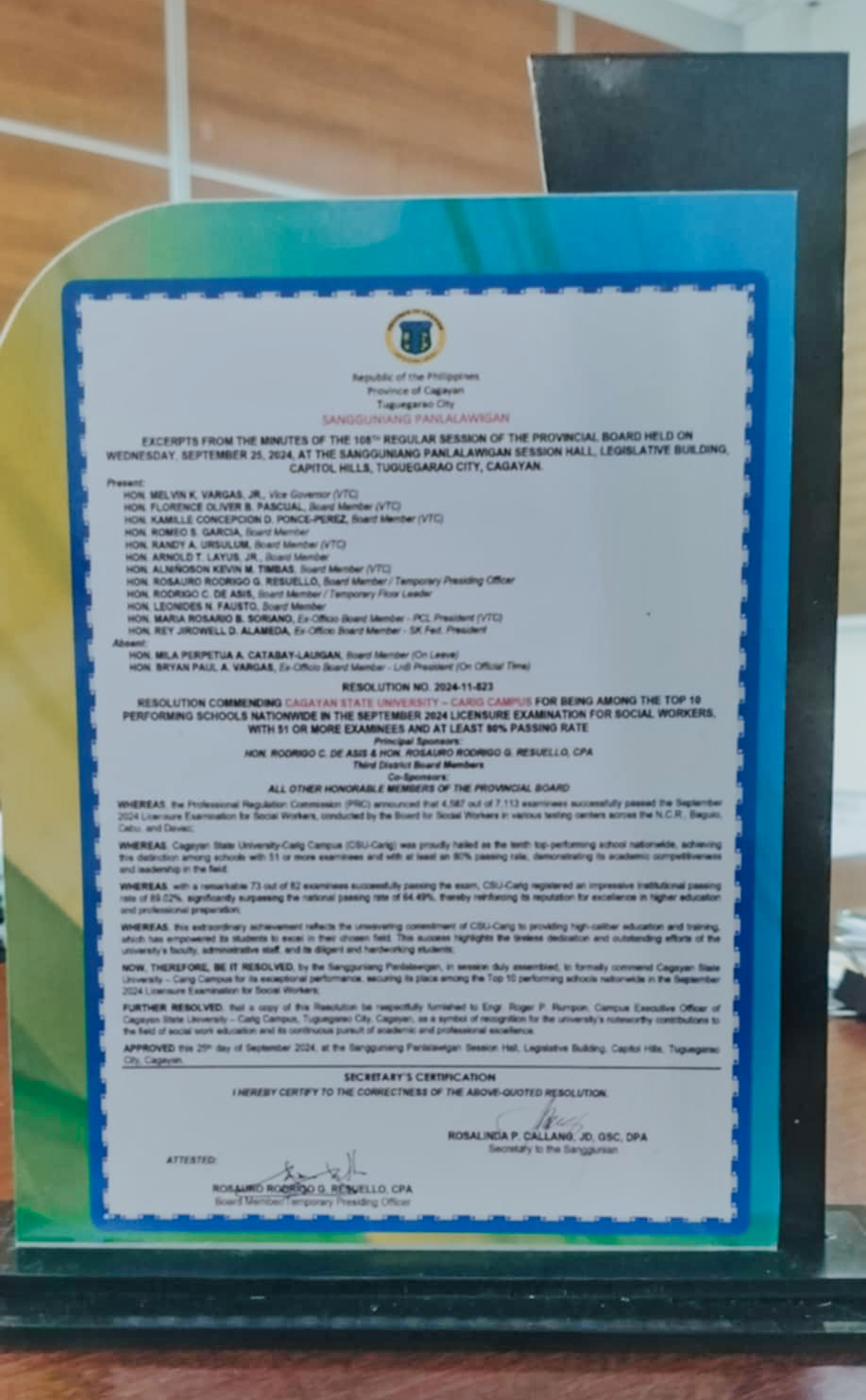 Further, the Sangguniang Panlalawigan of the Province of Cagayan recognized the significant achievement of the university through Resolution No. 2024-11-823, commending CSU–Carig Campus for being among the Top 10 Performing Schools nationwide in the September 2024 Licensure Examination for Social Workers. This honor highlighted the exceptional performance of CSU with 51 or more examinees and an institutional passing rate exceeding 80%.