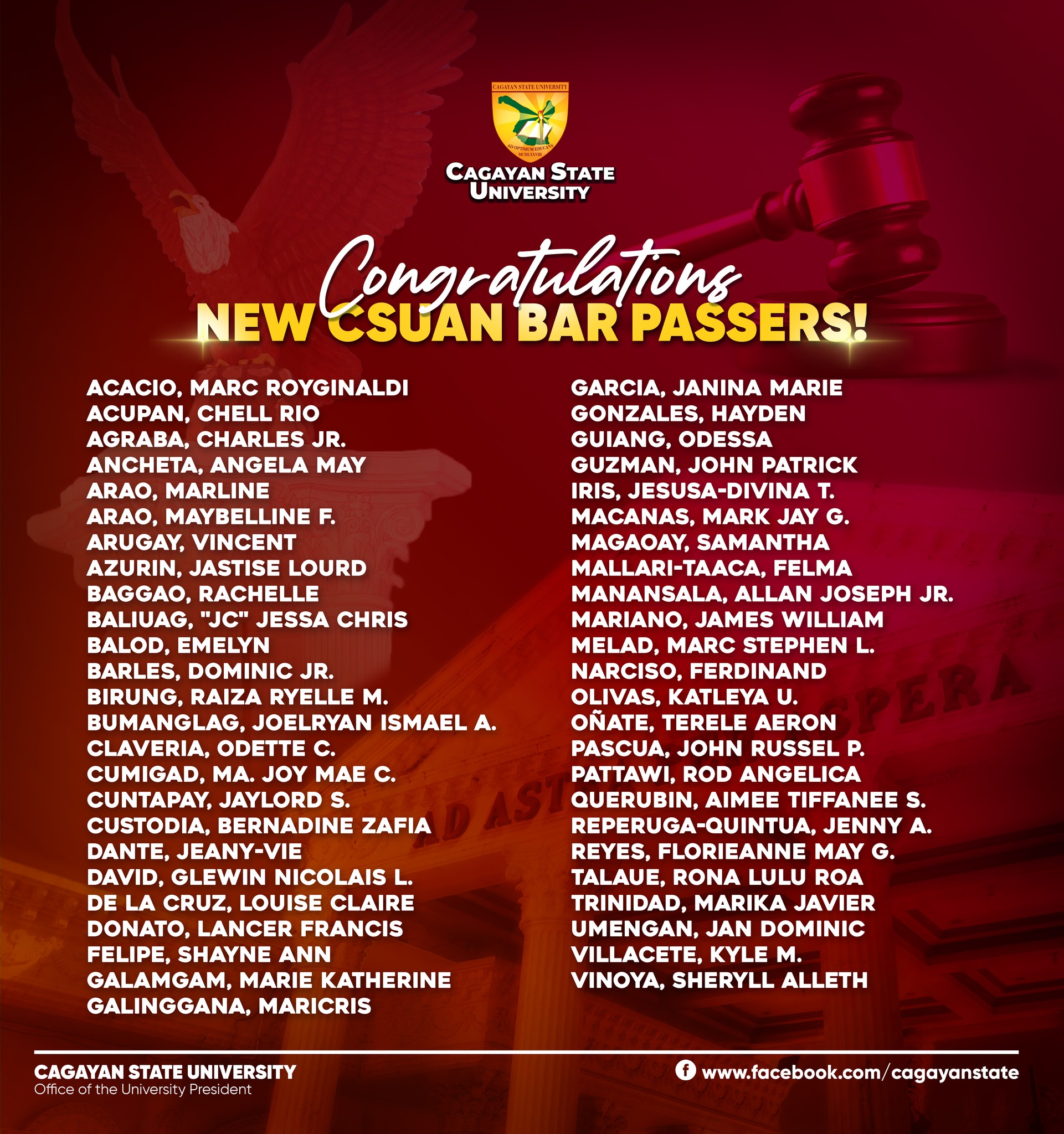 Cagayan State University (CSU) celebrates another milestone as its College of Law posted an above-national passing performance in the September 2025 Bar Examinations. Cagayan State University (CSU) celebrates another milestone as its College of Law posted an above-national passing performance in the September 2025 Bar Examinations.