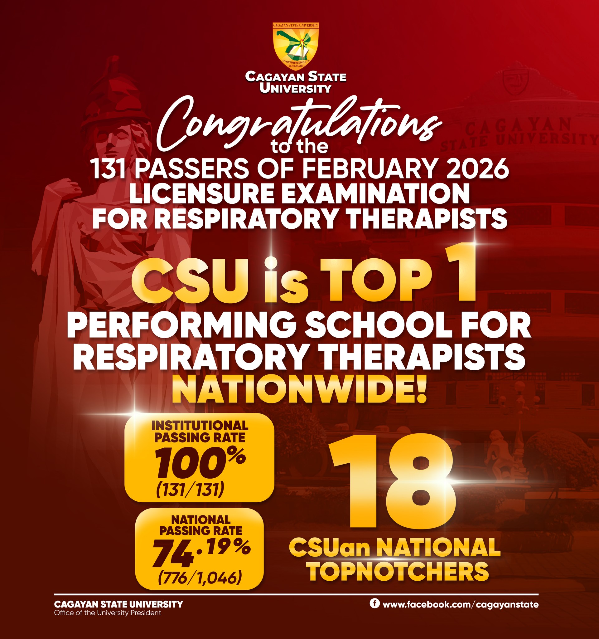 The Professional Regulation Commission (PRC) officially released on February 11, 2026, the results of the February 2026 Respiratory Therapists Licensure Examination, once again naming Cagayan State University (CSU) – Andrews Campus as the Top 1 Performing School nationwide, marking its eighth consecutive year at the top.
