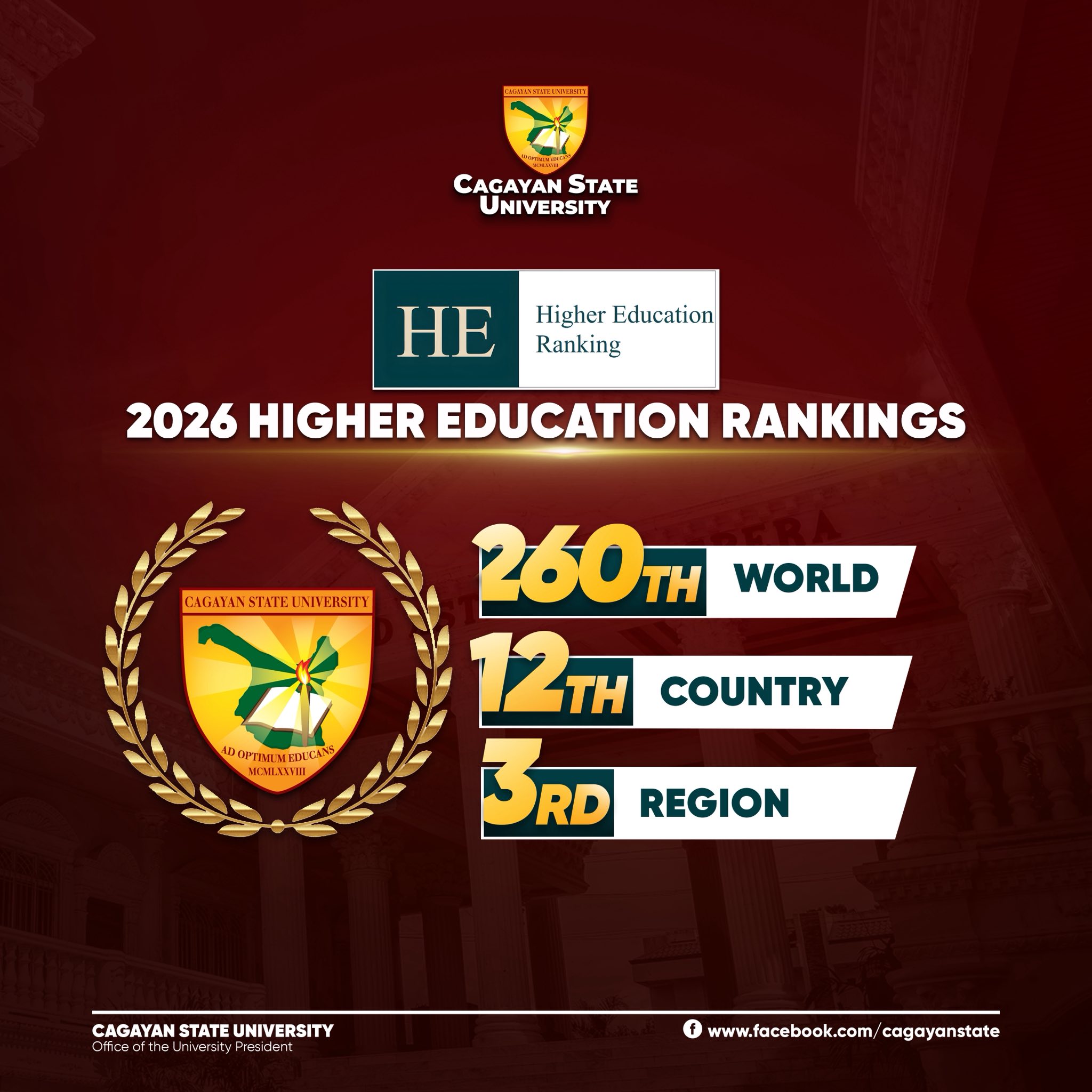 Cagayan State University (CSU) has been recognized in the 2026 HE Higher Education Ranking, placing 260th out of 507 universities worldwide, 12th in the Philippines, and 3rd in the region.