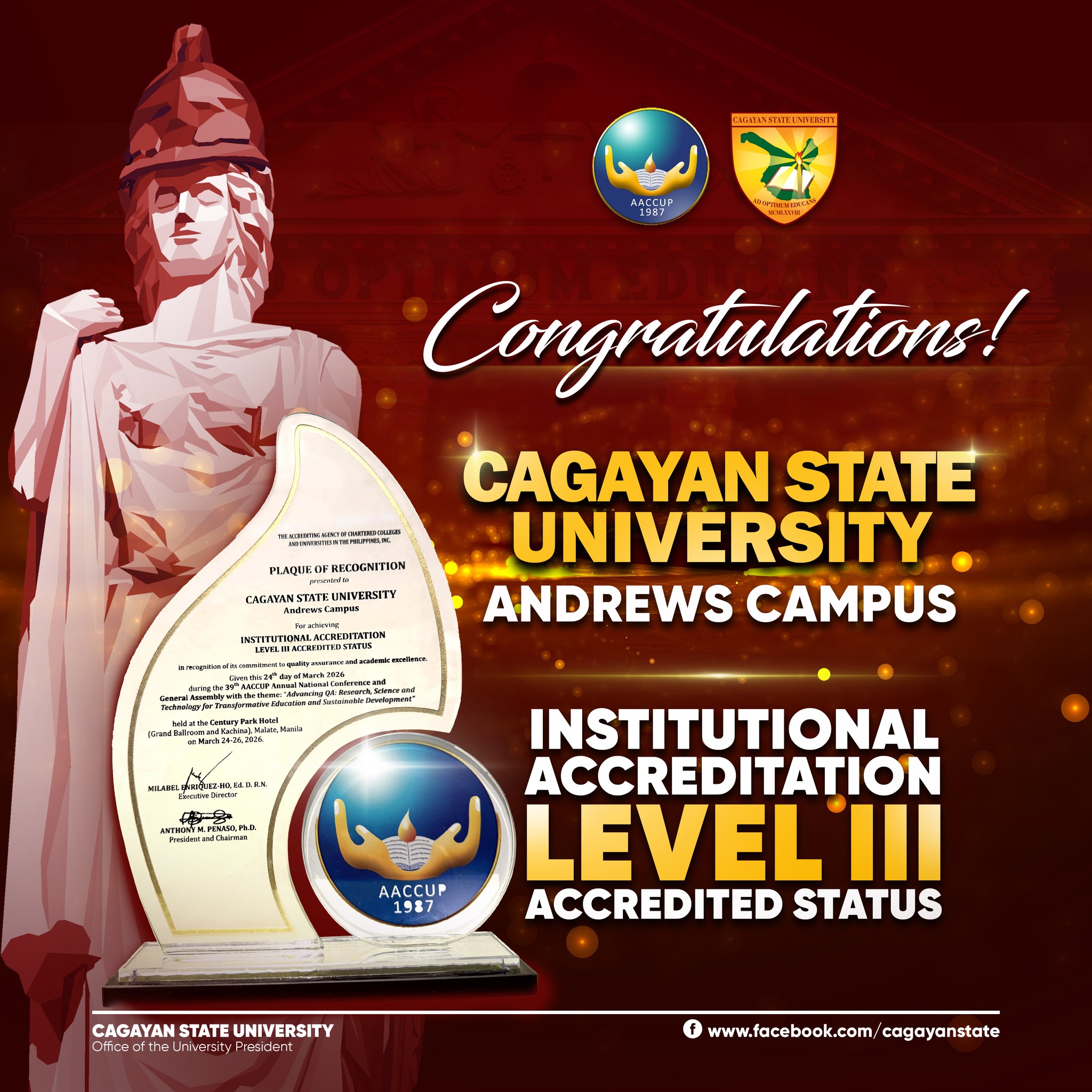 Cagayan State University Andrews Campus attains Level III Institutional Accreditation Status, awarded by Accrediting Agency of Chartered Colleges and Universities in the Philippines. This recognition highlights the campus’ excellence in academic delivery, governance, research, and extension services, demonstrating a well-established culture of quality and continuous improvement.