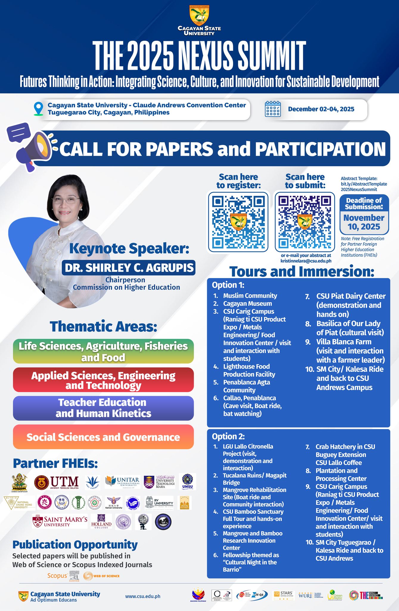 Cagayan State University is calling for papers for the 2025 Nexus Summit with the theme “Futures Thinking in Action: Integrating Science, Culture, and Innovation for Sustainable Development.” The summit will be held on December 2–4, 2025 at the Claude Andrews Convention Center, Tuguegarao City, Cagayan.
